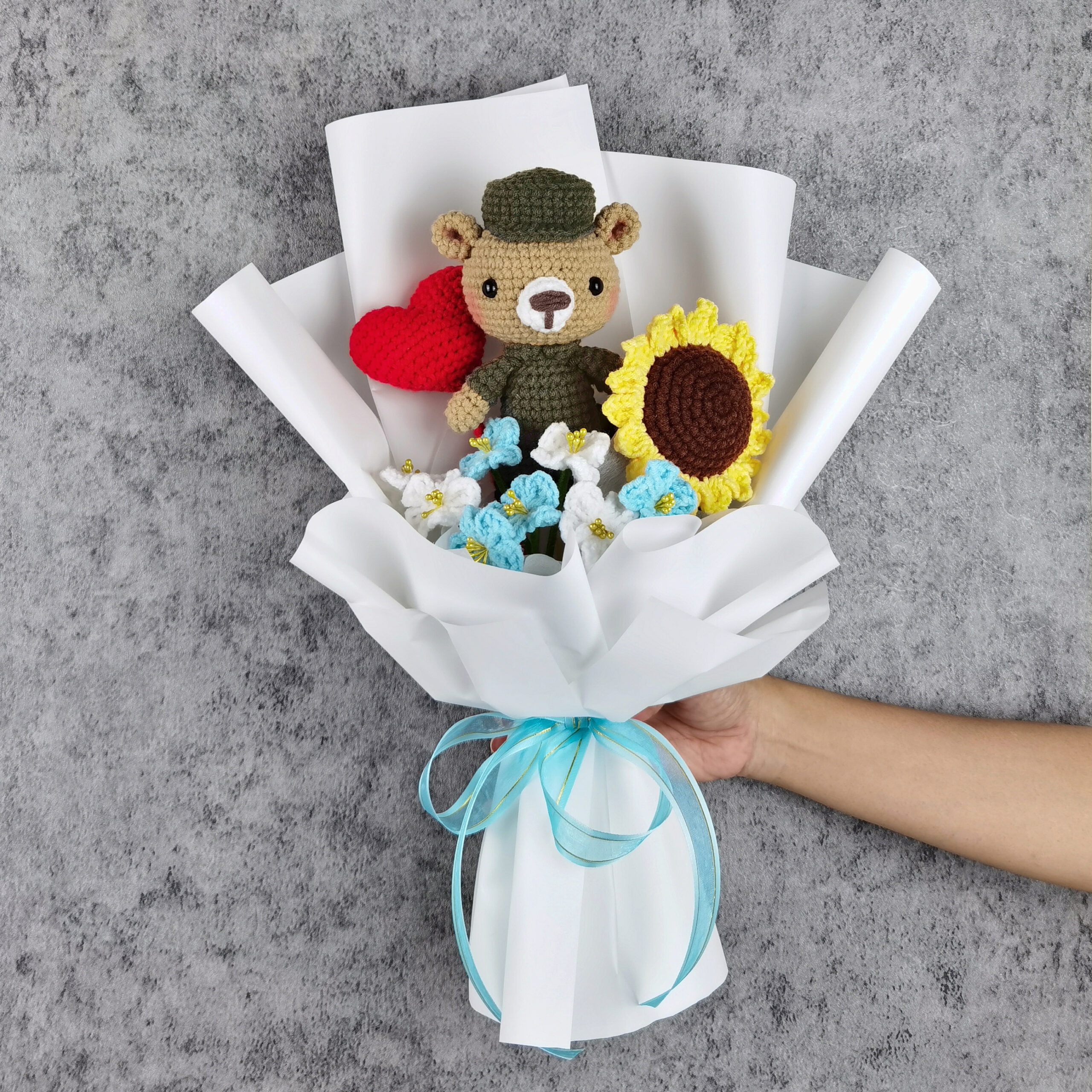 Note: Our crochet bear bouquets are 100% handmade, requiring a lead-time of at least 5 working days for production. Avoid last-minute ordering and changes.